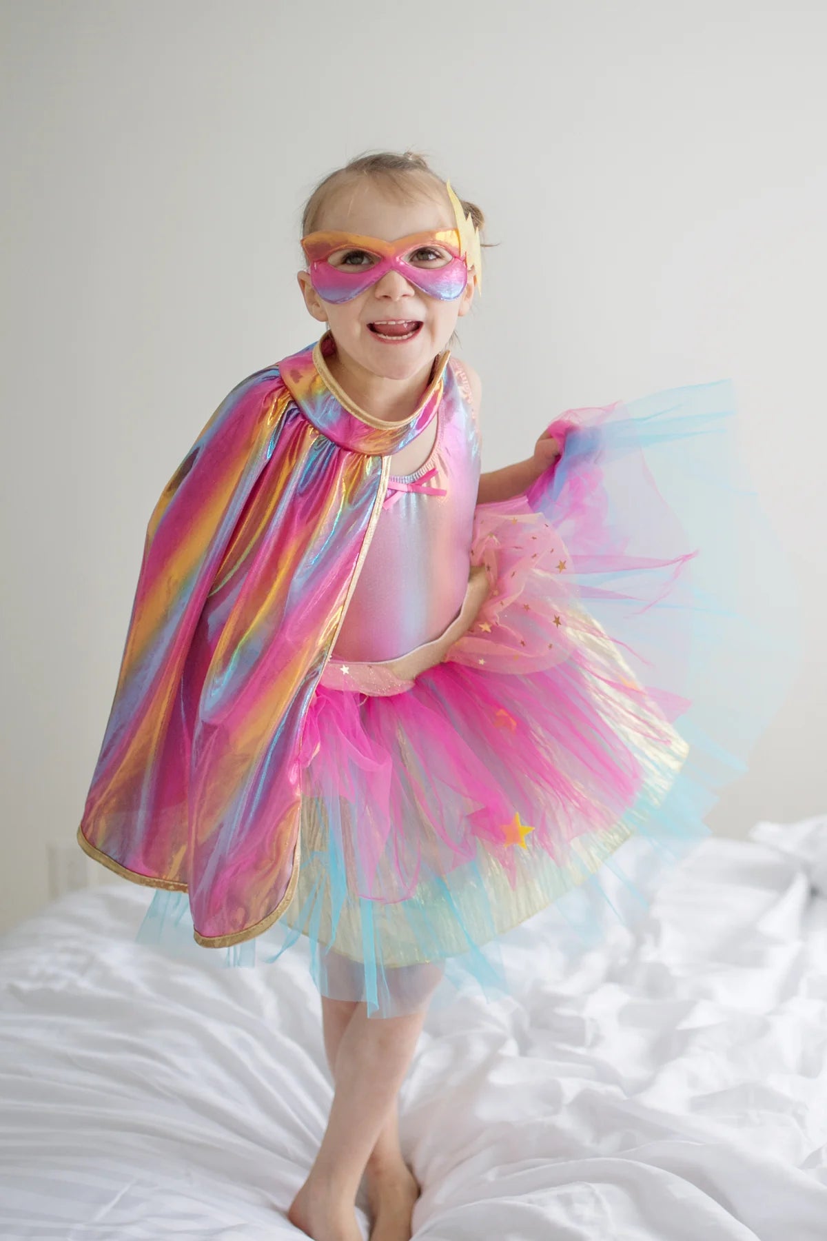 Super Duper Tutu, Cape, & Mask Sets are AMAZING 3-pc Super Sets! These designs could be superhero or rock star outfits! Waistbands are fabric wrapped for a nice finish & comfort (no scratching here). The emblems on the back of the capes are embroidered around the edges for a nice finish. The pink holographic cape is lined for a complete elegant finish. There are star and lightning bolt accents on the skirts with a small pc of round felt on the back to hold them securely to the tulle. The skirts have a peplum and two layers of tulle with a fantastic crinkle metallic bottom lining layer. The masks are double sided and have a lightning bolt feature to match the set perfectly.